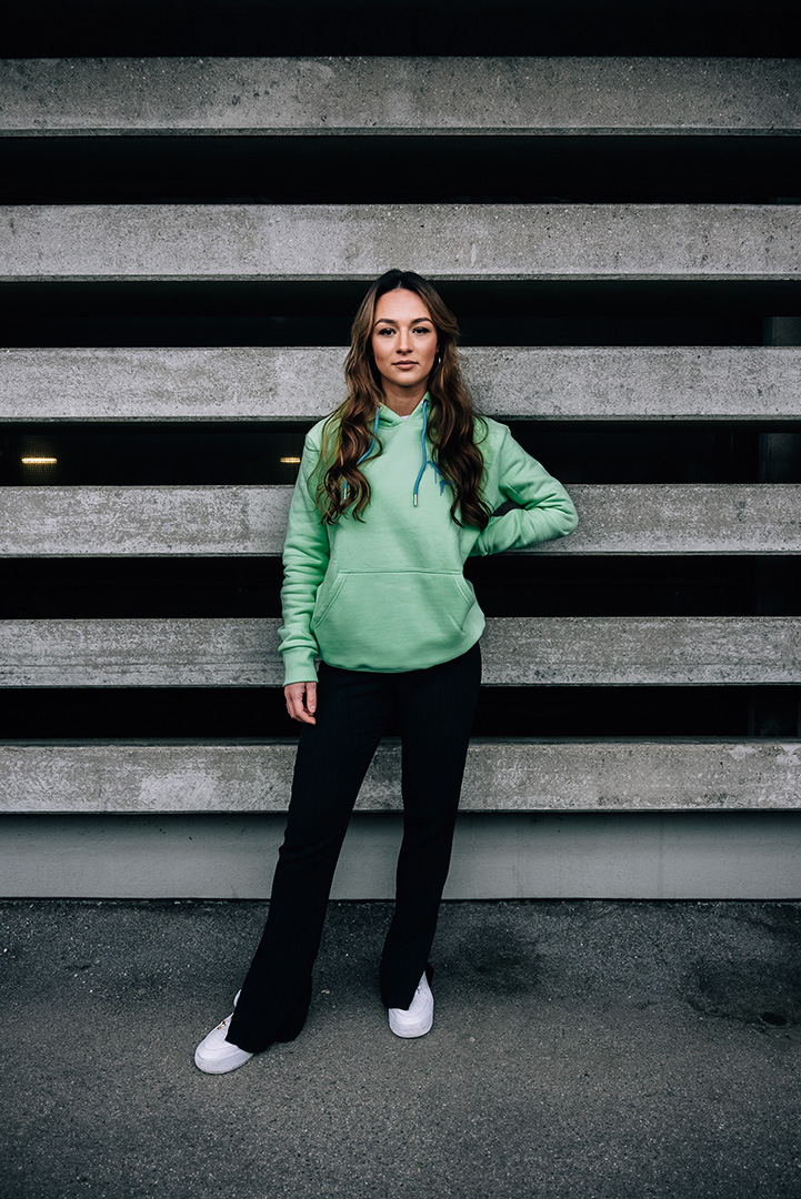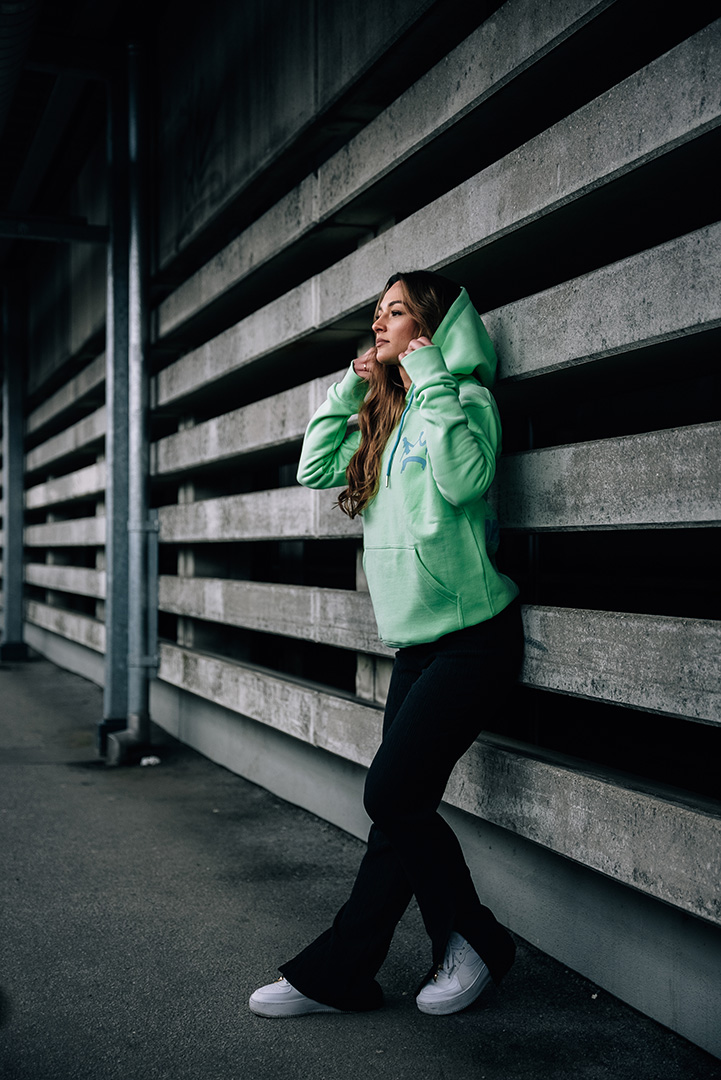 Details: Druck in hellblau / Print vorne und hinten / Kordeln mit Metallösen und Metallenden / Bai-Taschen vorne zum Durchgreifen
